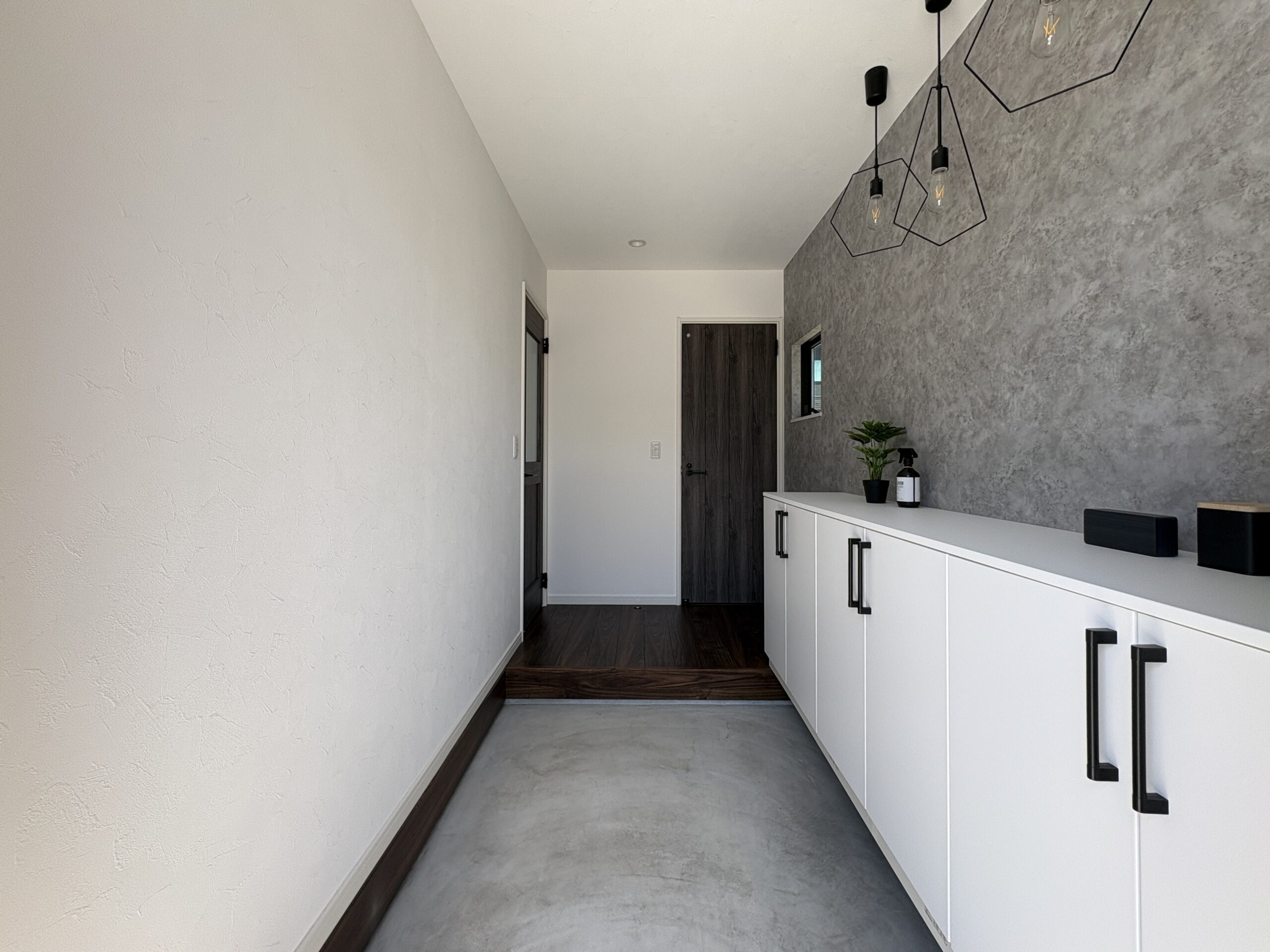 白の収納とグレーの壁が、玄関を明るく見せて生活感を抑えます!