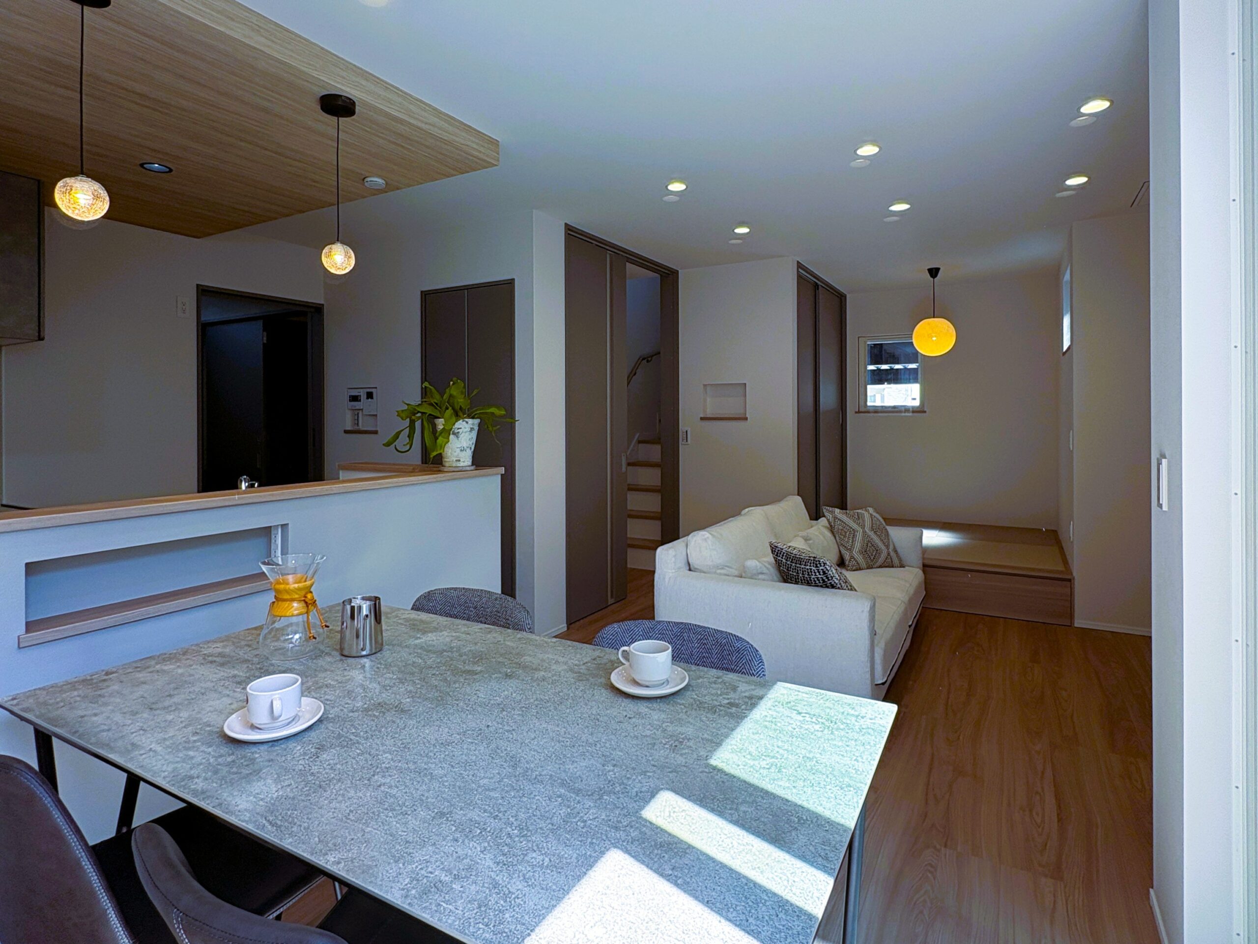 リビングには小上がりの畳スペースを設け、くつろぎと使いやすさを両立しています。