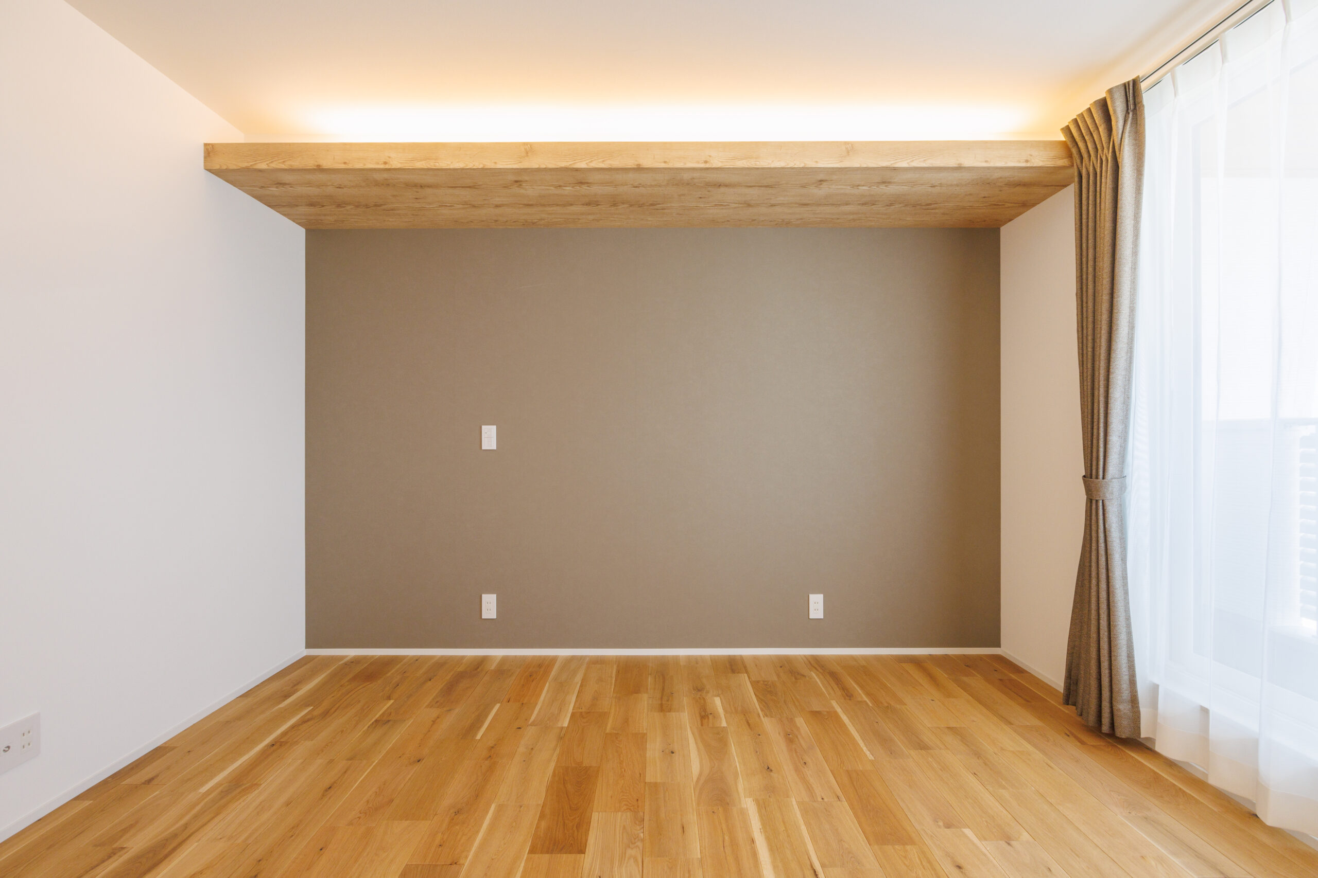 グレーのアクセント壁とオーク床で落ち着いたトーンに。