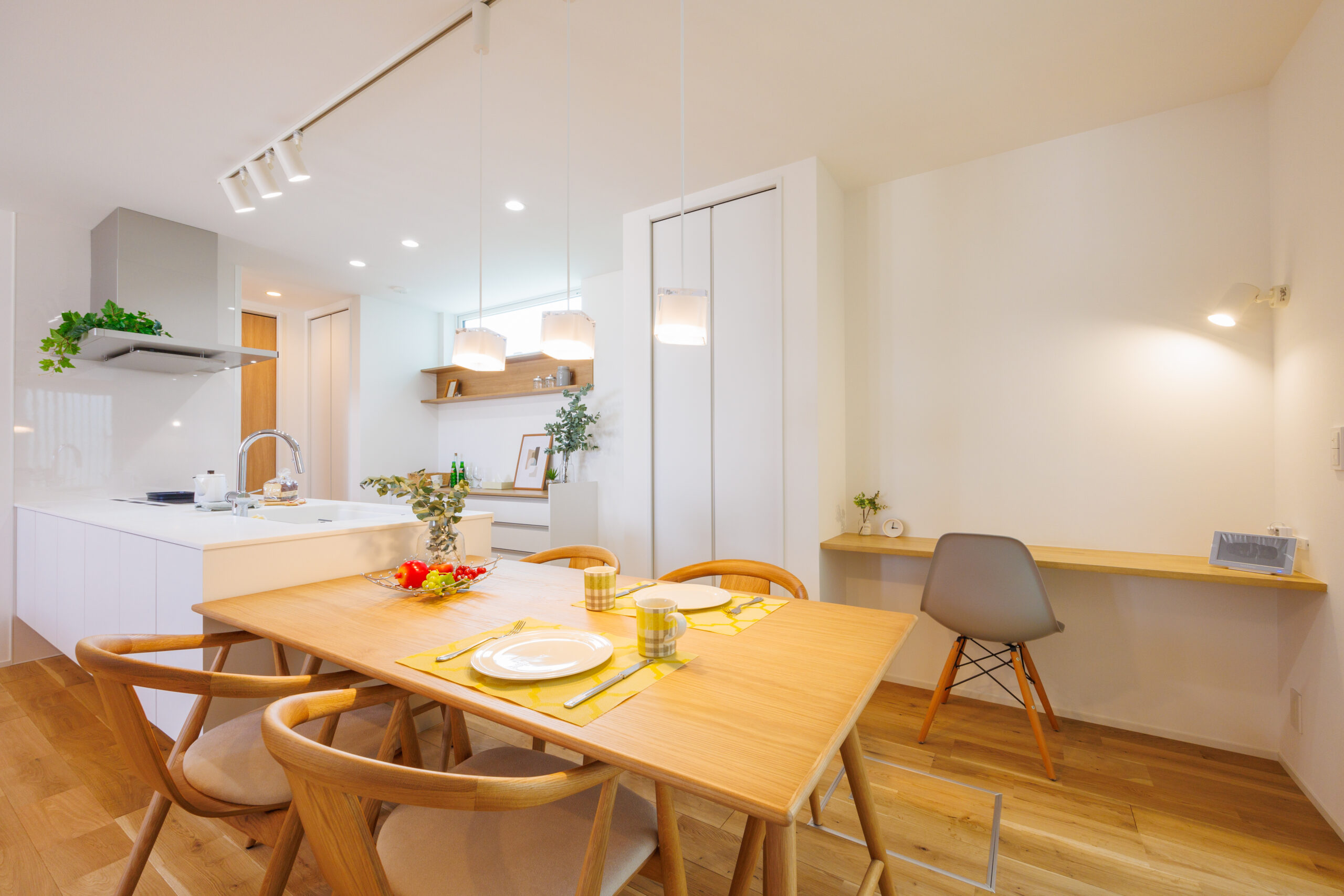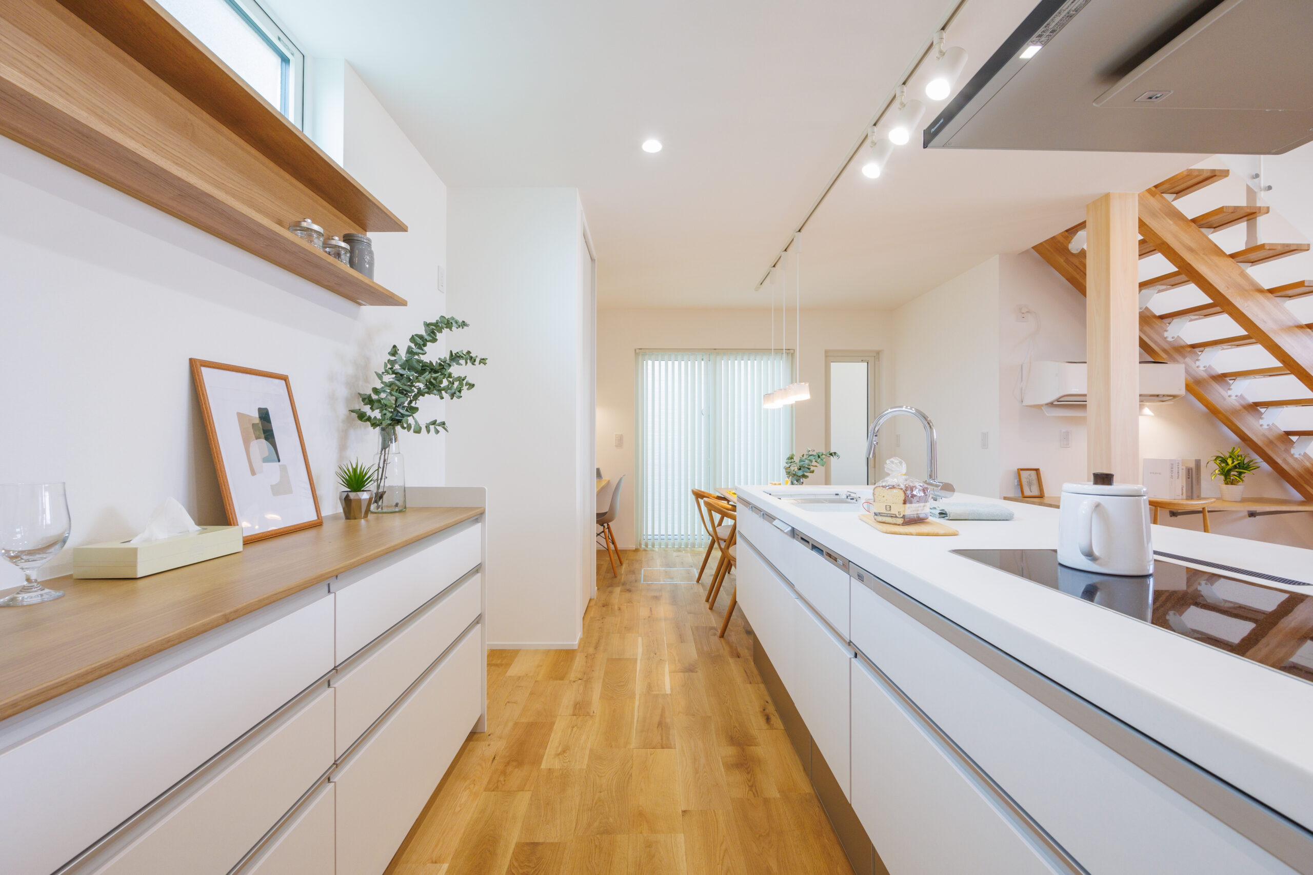 ダイニング横のスタディカウンター、回遊しやすいキッチン、玄関手洗い、ビルトインガレージまで。