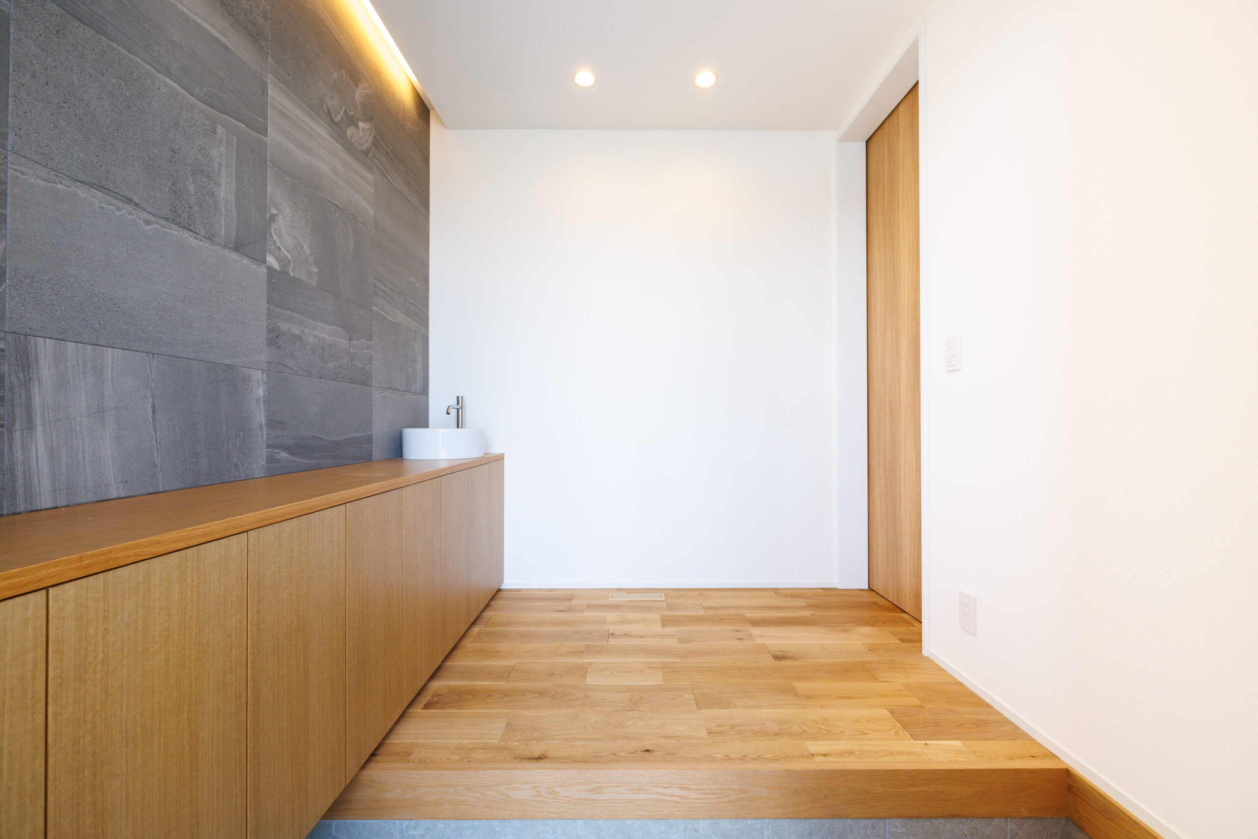 壁面いっぱいの造作収納は靴や外出小物だけでなく、防災グッズまでまとめて管理できます。