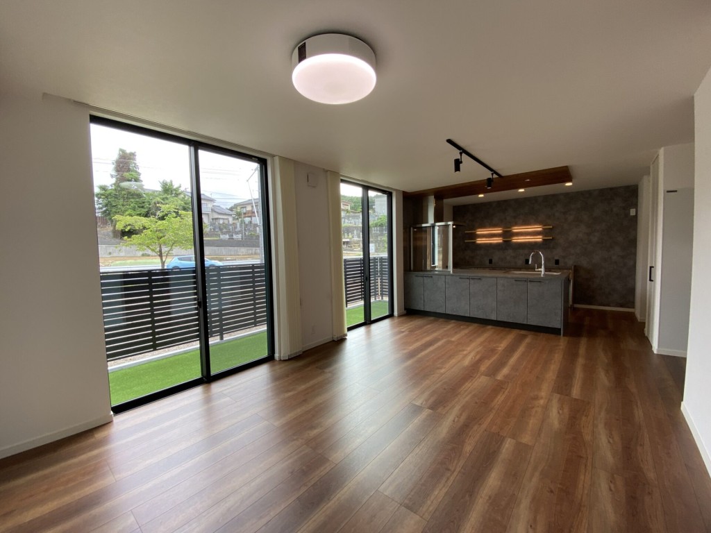 空間が引き締まるダークカラーを基調としたLDKからは、お庭の緑が映えリラックス効果が期待できそうです。